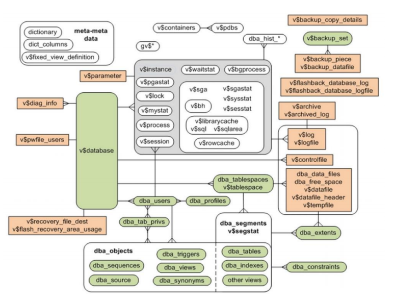 - Dynamic Performance View라고도 하며, 현재 Database의 상태에 관한 정보로 주로 DBA에게만 액세스가 허용되어 있다. 주로 DBA의 모니터링 작업용 정보를 제공하며, X$ 테이블을 베이스로 하는 뷰이다.