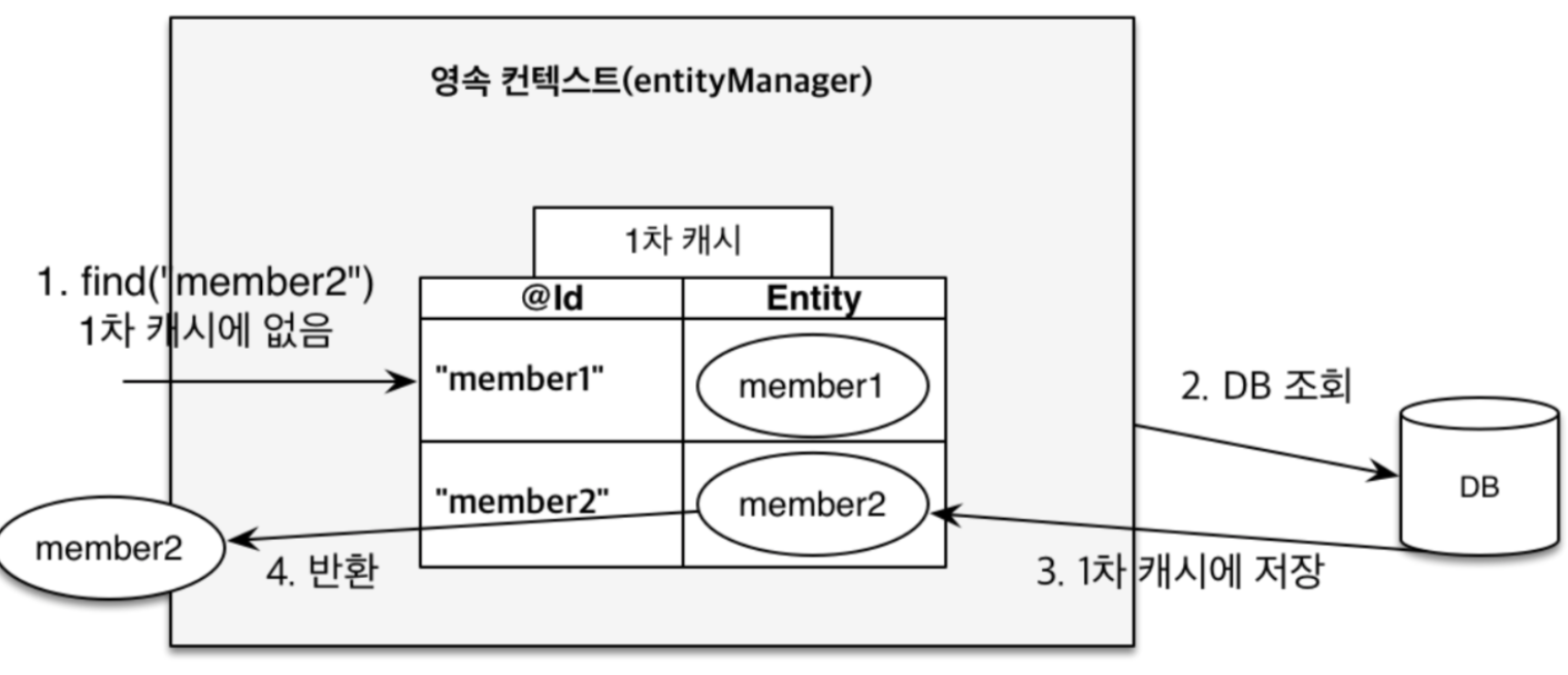 1. find("member2")실행해면 "member2" 로 1차 캐시에서 찾아본다. 그러나 존재하지않음