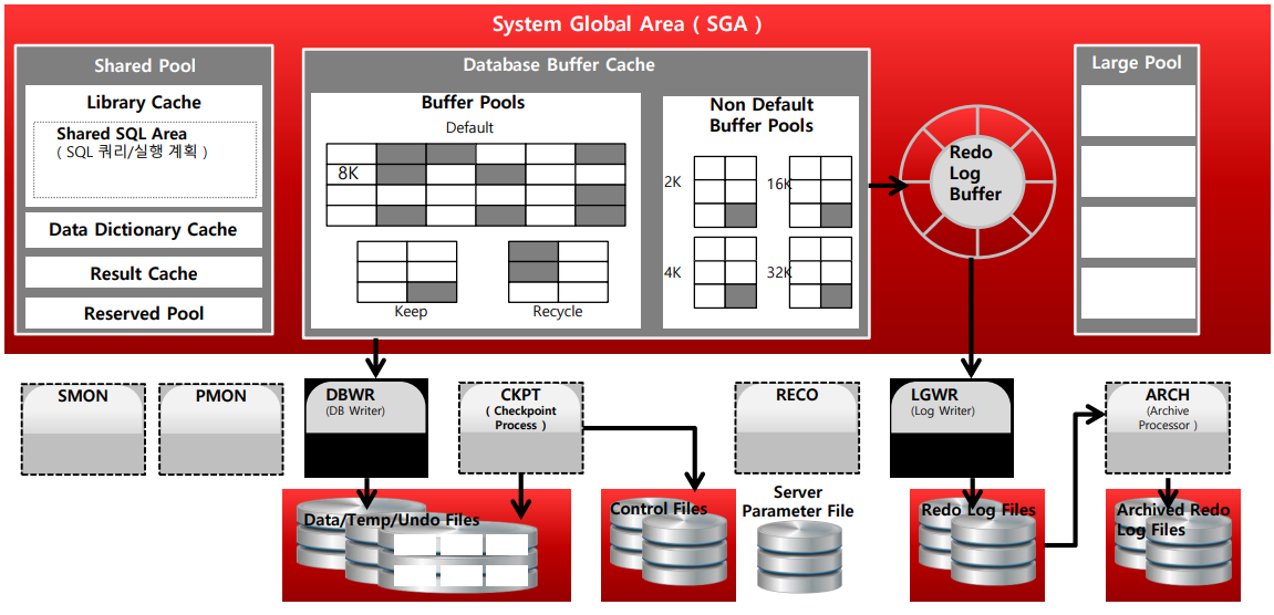 - Oracle Backgound Process : SMON, PMON, DBWR, CKPT, RECO, LGWR 등 매우 많은 프로세스가 존재한다.