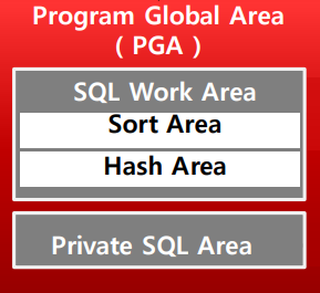 - SQL Work Area : 정렬에 관련된 작업 Sort by, Group by 같은 정렬이 필요할 경우 or Hash join 시 디스크 I/O를 감소