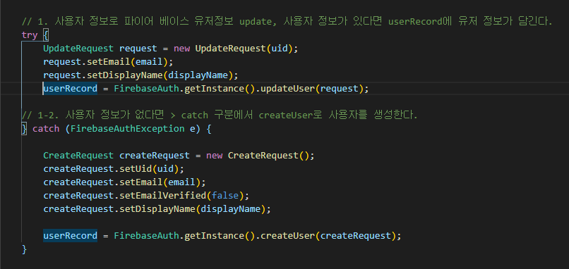 // 1. 사용자 정보로 파이어 베이스 유저정보 update, 사용자 정보가 있다면 userRecord에 유저 정보가 담긴다.
