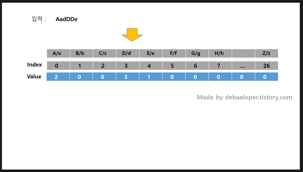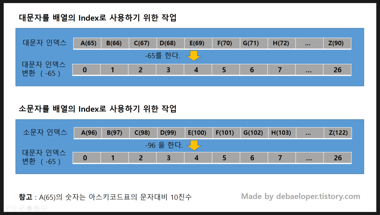 - 문제를 읽으면서 내가 느낀점은 "아스키코드"를 사용하라고 말하는 것 같았다... 나만 그런건가? 문자의 개수를 count할 때 대문자 (A~Z = 65~90) , 소문자 (a~z = 96~122) 의 구분없이 count++ 해주면 된다. 쉽게 설명하기 위해서 간단히 그림을 그렸다~ 대문자,소문자를 Index로 사용하기 위한 작업과 AadDDe 라는 입력의 결과로 배열의 결과를 볼수 있는 두가지 그림이 있다.